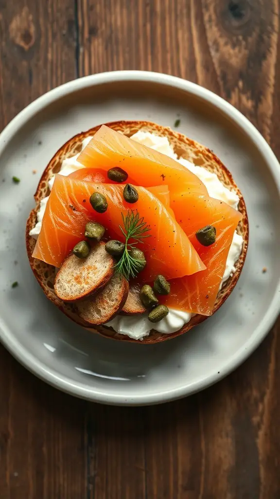 Salmon and cream cheese bagels are a classic treat that brings together rich flavors and delightful textures. The image shows a beautifully arranged bagel topped with luscious slices of salmon, creamy cheese, and a sprinkle of capers. This combination is not only visually appealing but also incredibly tasty.