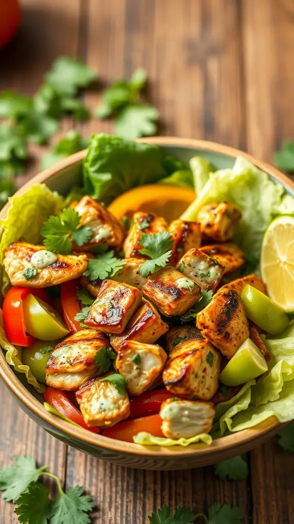 The salad features tender pieces of chicken, sautéed bell peppers, and crisp lettuce. The cilantro dressing adds a refreshing kick that ties all the flavors together. You can customize it by adding your favorite toppings like avocado or cheese.