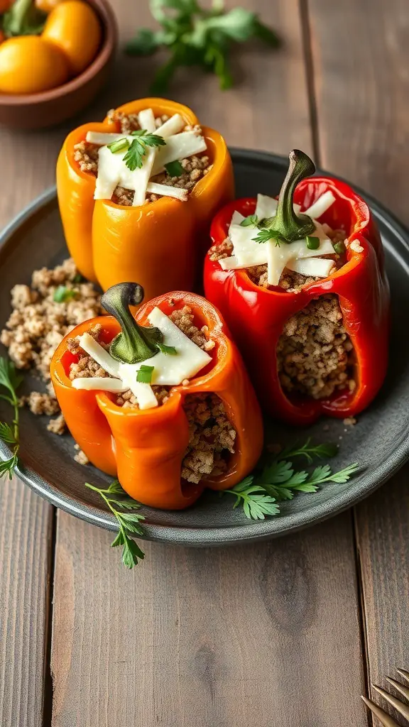 The vibrant colors of the peppers add a cheerful touch to your dinner table. Each pepper is packed with a delicious mixture of protein and grains, topped with a sprinkle of cheese for extra flavor. This dish is not only tasty but also visually appealing, making it a hit with both kids and adults.