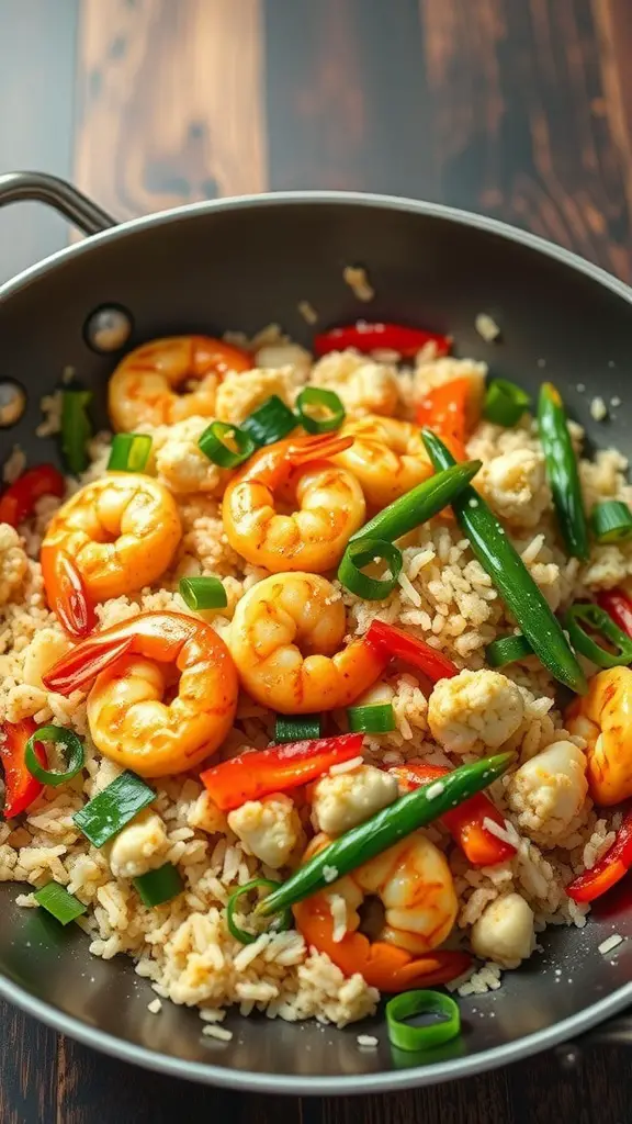 Cauliflower Rice Stir-Fry with Shrimp is a delightful dish that’s perfect for family dinners. This recipe combines the lightness of cauliflower rice with the savory flavors of shrimp and fresh vegetables. The vibrant colors of the bell peppers and green onions make it visually appealing, while the shrimp adds a satisfying protein boost.