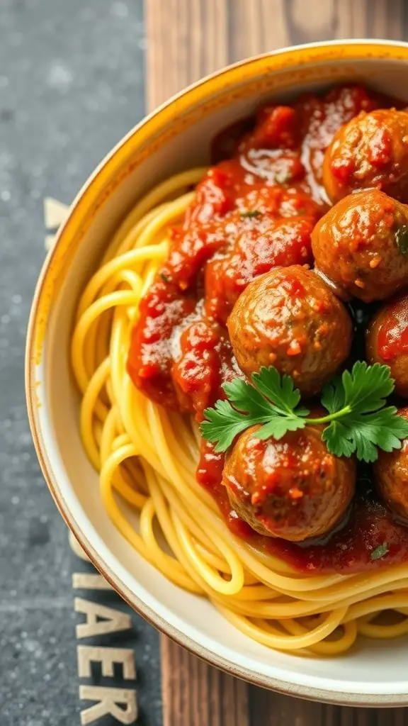 The image shows a delicious bowl of spaghetti squash topped with rich marinara sauce and hearty meatballs. The vibrant red sauce contrasts beautifully with the golden strands of squash. A sprinkle of fresh herbs adds a pop of color and flavor, making this meal visually appealing.