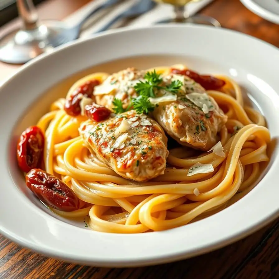 I like to twirl the pasta onto the plate, creating a little nest, then place the chicken on top. Spoon the creamy sauce generously over the chicken and pasta, and finish with a sprinkling of freshly chopped parsley or basil. A few shavings of parmesan on top add a touch of elegance. For a more rustic, homey feel, I sometimes leave the chicken sliced in chunks, letting the sauce pool naturally around the pasta.