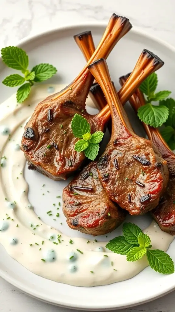 Grilled lamb chops are a fantastic choice for gatherings. They bring a touch of elegance and mouthwatering flavor to any meal. The image shows perfectly grilled lamb chops, their seared edges hinting at the deliciousness within. Each chop is beautifully arranged on a plate, accompanied by a creamy mint yogurt sauce that adds a refreshing twist.