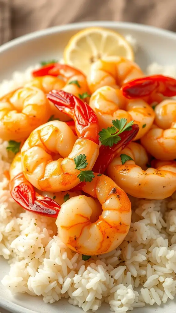 This dish is a delightful combination of juicy shrimp and fluffy rice, perfect for a quick meal. The shrimp are seasoned with lemon and herbs, giving them a fresh and zesty flavor. The vibrant colors of the shrimp and the bright green herbs make this dish visually appealing.