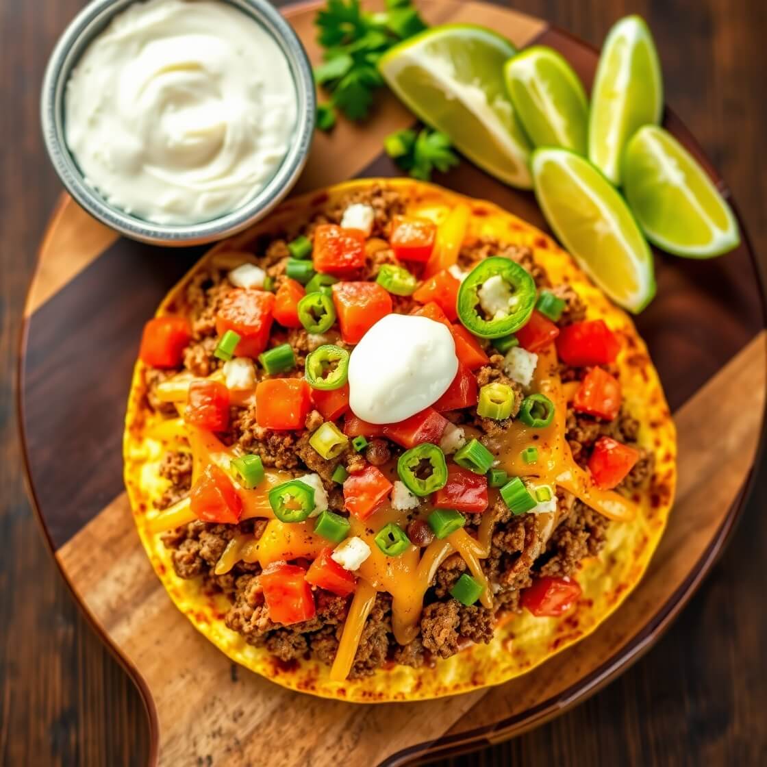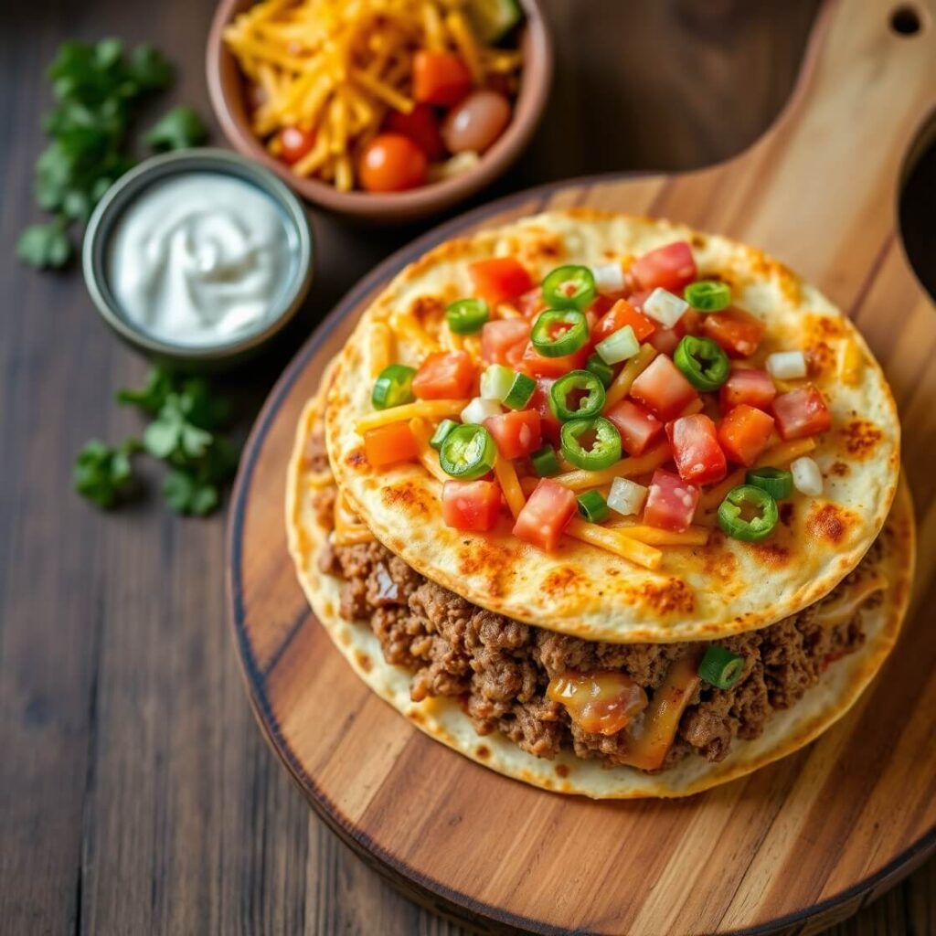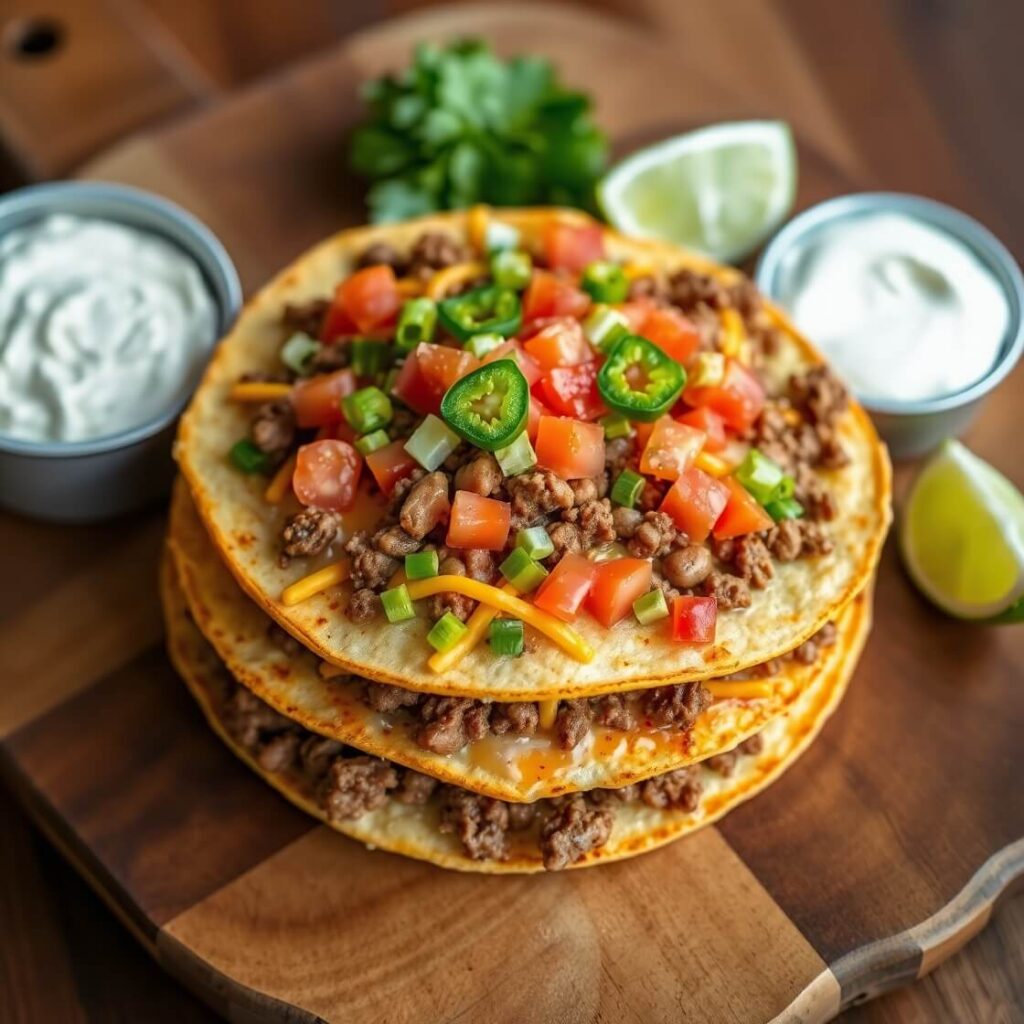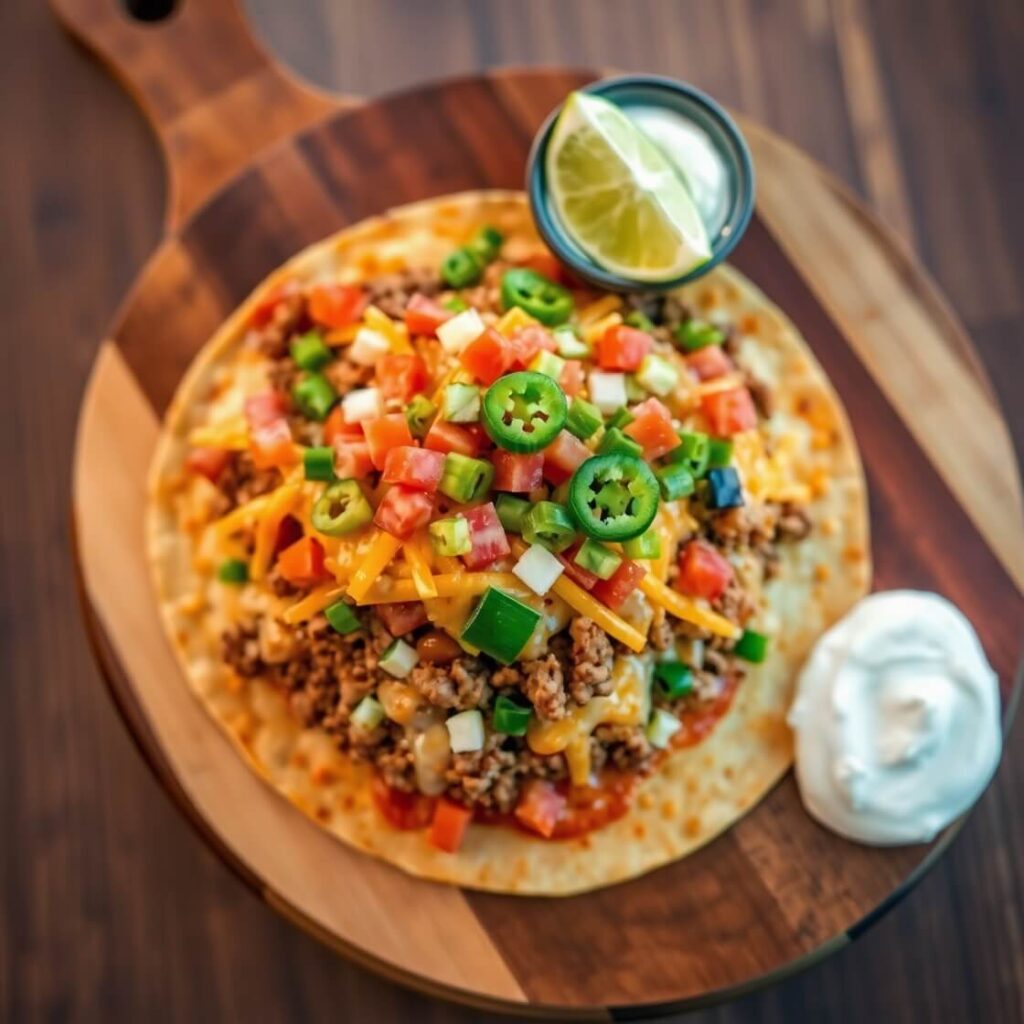 Well, for starters, it’s not your average pizza. Instead of dough, you’ve got crispy, golden tortillas. Instead of mozzarella and tomato sauce, there’s a luscious combo of cheddar, Mexican cheese blend, and a tangy, slightly spicy sauce. You’re also layering it with creamy refried beans and spiced ground beef that brings a full-on fiesta to your taste buds.