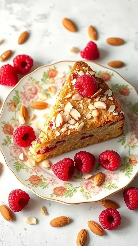 This Raspberry Almond Coffee Cake is a delightful treat perfect for Mother’s Day. The image showcases a beautifully sliced piece of cake, topped with fresh raspberries and slivered almonds. The floral plate adds a charming touch, making it an inviting dessert.