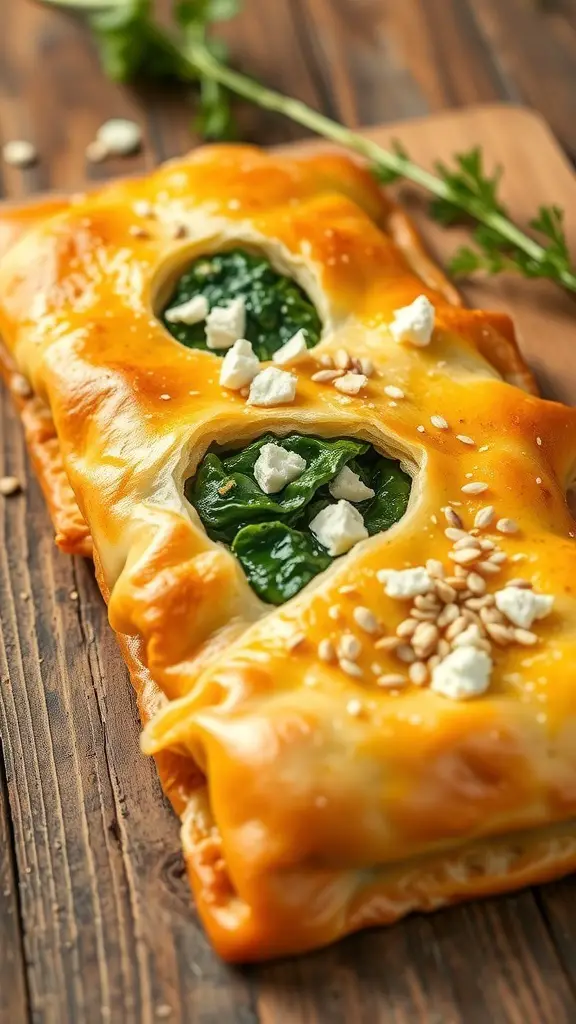 These savory spinach and feta puffs are a delightful treat that combines flaky pastry with a rich filling. The golden crust is inviting, while the green spinach peeks through, hinting at the deliciousness inside.