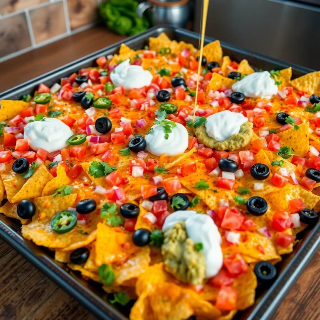 - Toppings: Black olives, green onions, and fresh cilantro elevate the nachos. For a creamy finish, dollops of sour cream or guacamole are perfect.