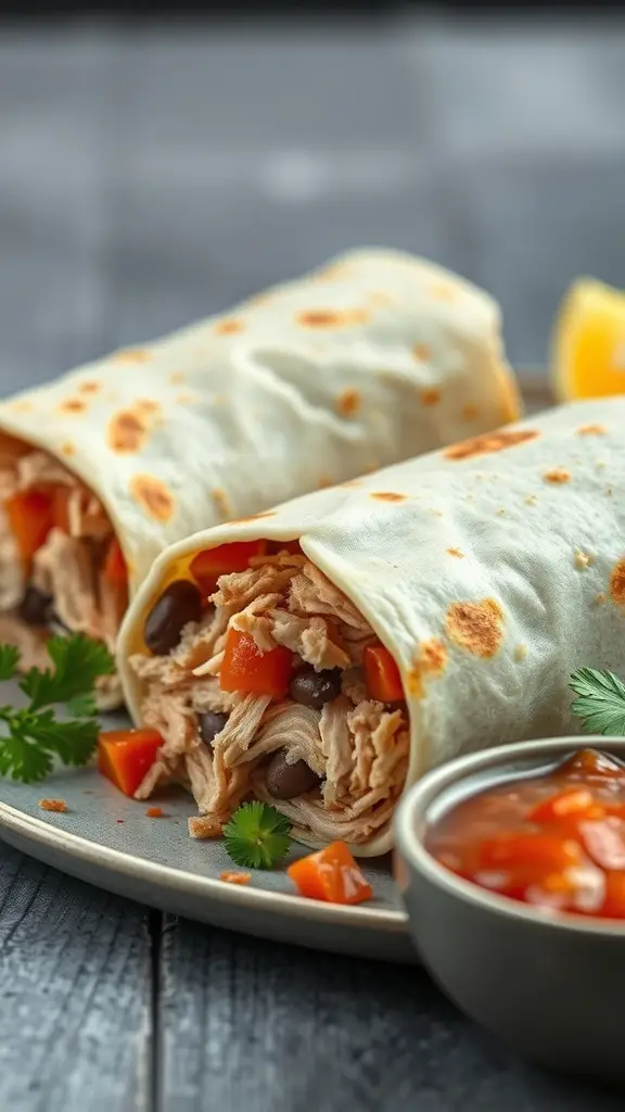 These turkey and bean burritos are a delicious way to enjoy shredded turkey. They are packed with flavor and are super easy to make. The image shows warm tortillas filled with tender turkey, black beans, and fresh diced peppers.