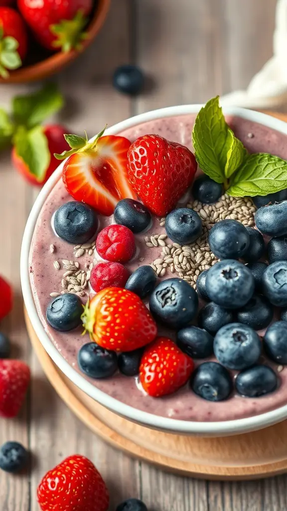 This Berry Bliss Smoothie Bowl is a delightful treat that combines the freshness of berries with a creamy base. The vibrant colors of strawberries, blueberries, and raspberries make it visually appealing and inviting. Topped with chia seeds and mint leaves, it’s not just a feast for the eyes but also packed with nutrients.