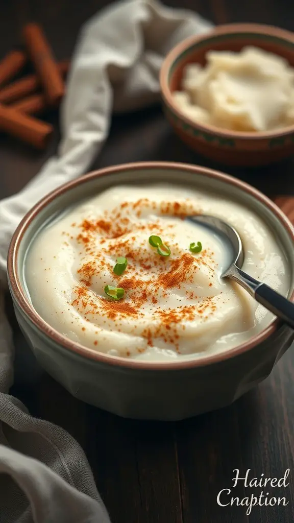Rice pudding is a classic comfort dessert that warms the heart. This creamy dish is often made with simple ingredients like rice, milk, sugar, and spices. The image shows a bowl of rice pudding topped with a sprinkle of cinnamon, making it look inviting and delicious.