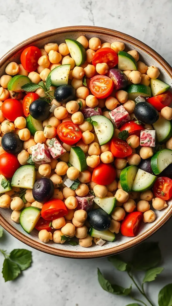 To make this salad, you’ll need canned chickpeas, diced cucumbers, halved cherry tomatoes, black olives, and some fresh herbs. A simple dressing of olive oil, lemon juice, salt, and pepper ties everything together. Just toss all the ingredients in a bowl, drizzle the dressing, and mix well.