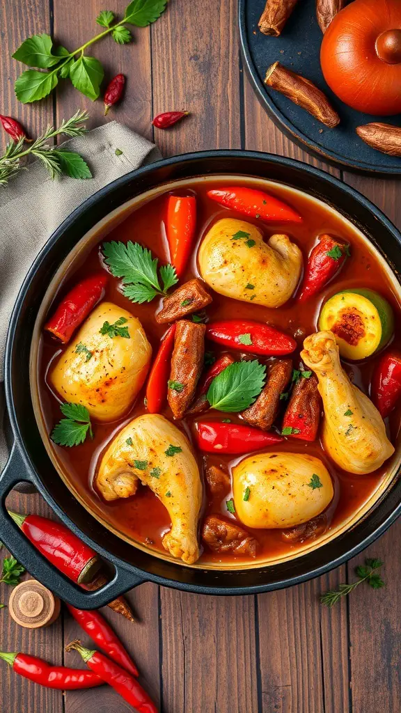 This Zesty Chicken and Chorizo Stew is a colorful dish that brings warmth and flavor to your table. The image shows a hearty pot filled with tender chicken pieces, vibrant red peppers, and slices of chorizo, all simmered in a rich broth.