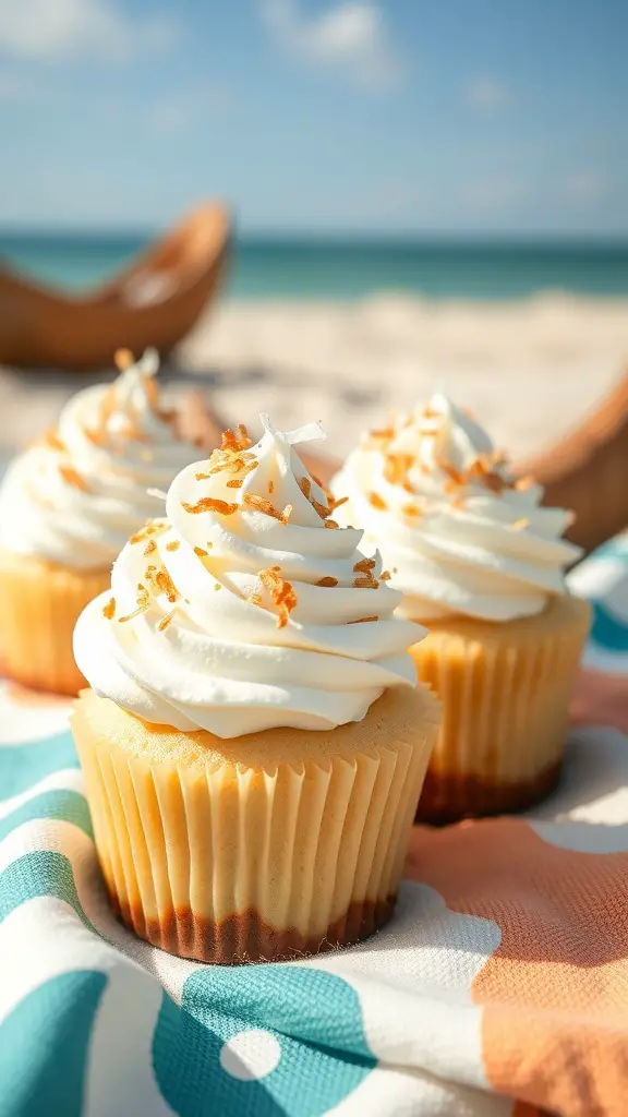 These Coconut Cream Pie Cupcakes are a delightful treat perfect for summer. The image shows three beautifully frosted cupcakes topped with toasted coconut flakes. They sit on a colorful beach towel, with a serene ocean backdrop, making them look even more inviting.