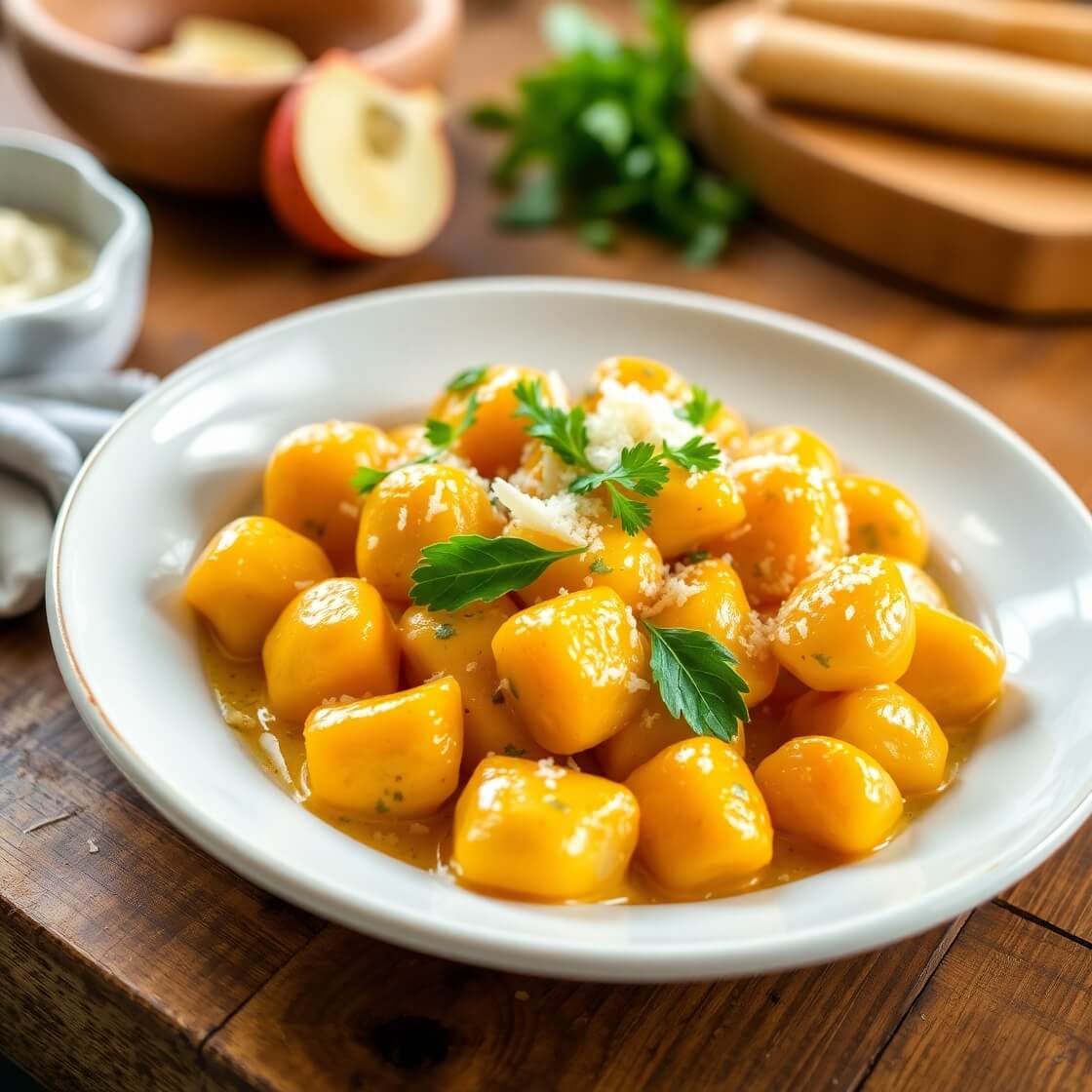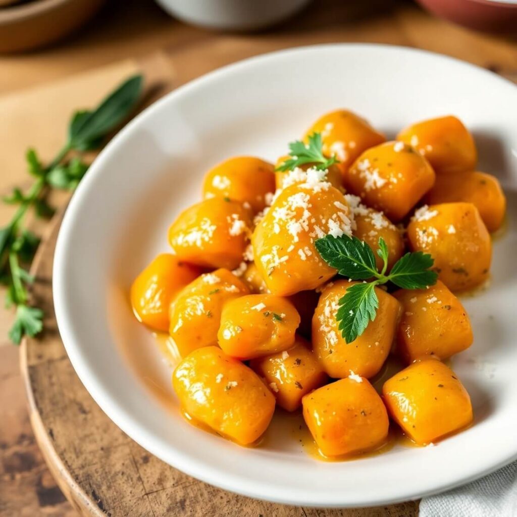 For a more dramatic presentation, you can plate the gnocchi in a shallow bowl, drizzle with sauce in a zig-zag pattern, and top with a few toasted pine nuts or a sprinkle of chili flakes for a little heat. Remember, we eat first with our eyes, so presentation matters. Using white or light-colored plates really makes the golden-orange gnocchi stand out beautifully.