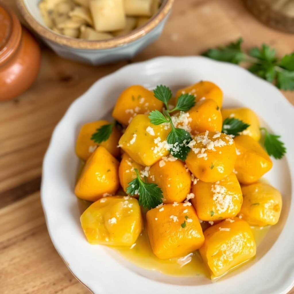 For a more dramatic presentation, you can plate the gnocchi in a shallow bowl, drizzle with sauce in a zig-zag pattern, and top with a few toasted pine nuts or a sprinkle of chili flakes for a little heat. Remember, we eat first with our eyes, so presentation matters. Using white or light-colored plates really makes the golden-orange gnocchi stand out beautifully.