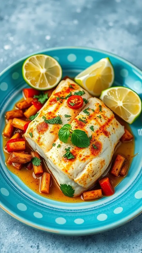 The image showcases a beautifully cooked piece of tilapia, garnished with fresh herbs and served with colorful vegetables. The bright lime wedges add a pop of color and hint at the tangy flavor that awaits.