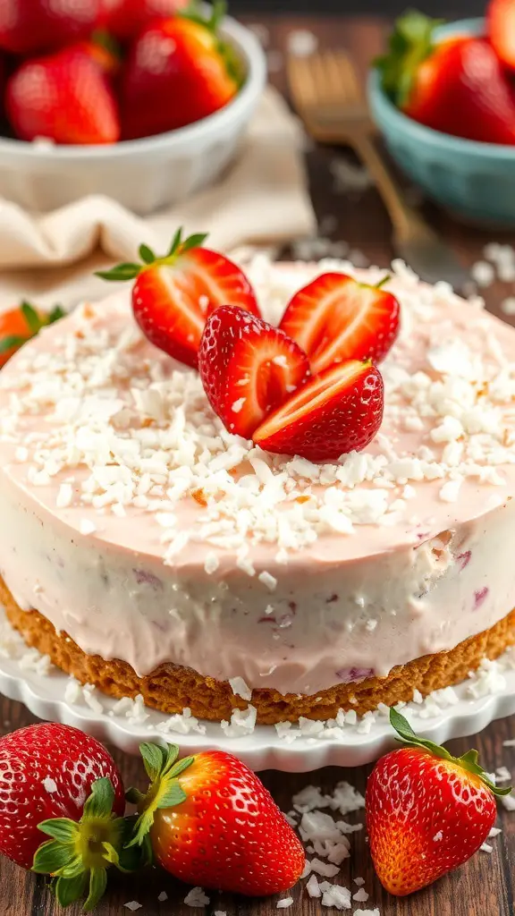 The cake is covered in a fluffy layer of coconut cream, topped with shredded coconut that adds texture and flavor. The white color gives it a clean and elegant look, making it visually appealing for any celebration.