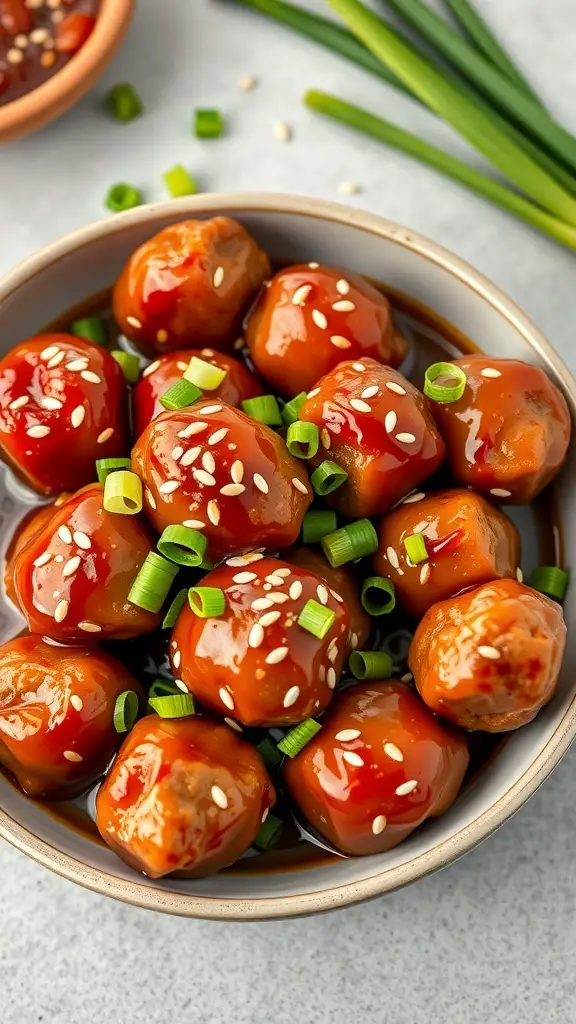 The image showcases a bowl of these delicious meatballs, glistening with a rich sauce. The vibrant red hue of the sauce is complemented by a sprinkle of sesame seeds and fresh green onions, adding a pop of color and freshness.