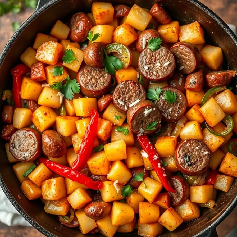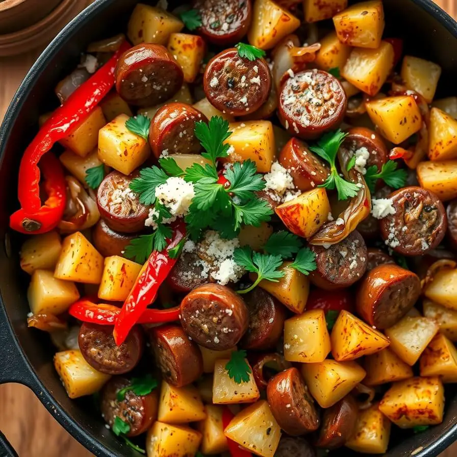 If you want to get a bit fancy, arrange the potatoes and sausage in neat clusters rather than tossing everything together. This gives a visually appealing contrast of colors and textures. For a cozy weeknight dinner, a simple wooden serving spoon and a couple of small bowls on the side are perfect—it invites everyone to dig in.