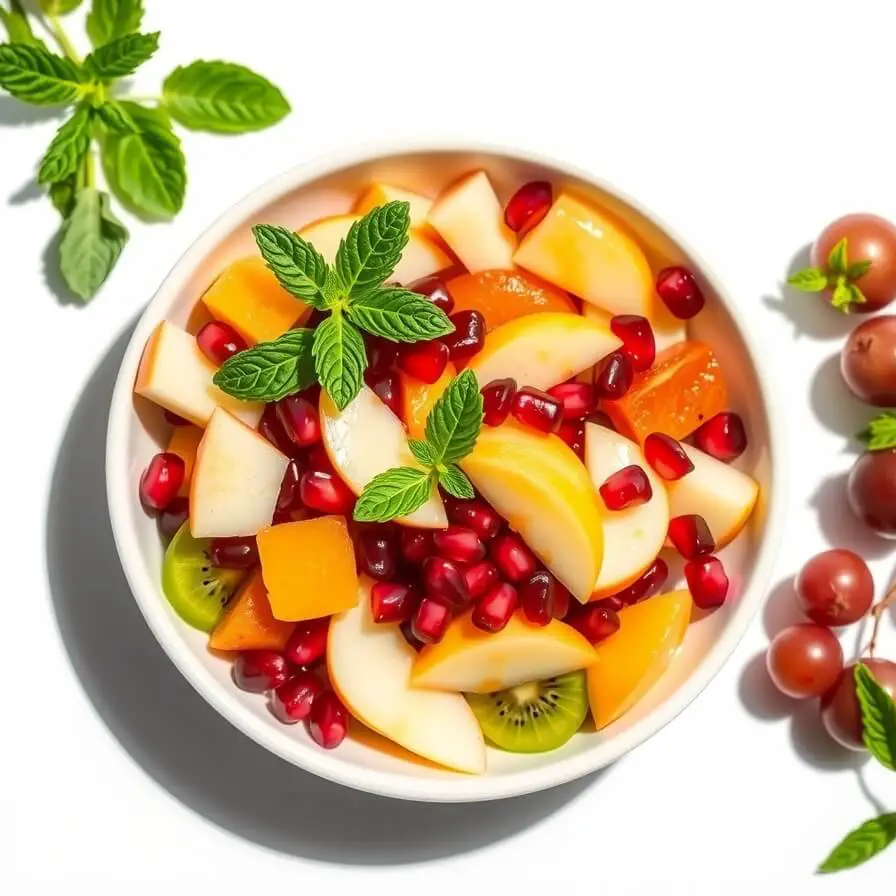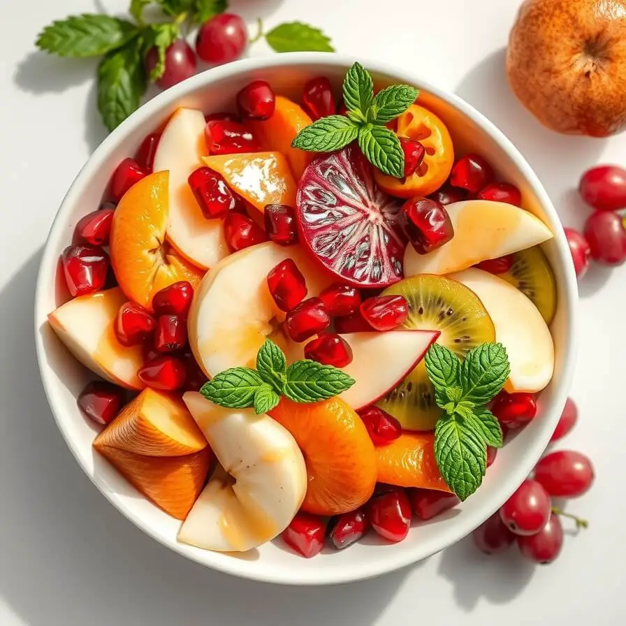 Layer the fruits instead of dumping everything in at once. I usually start with the apples and pears at the bottom, spoon the citrus segments on next, then scatter the grapes and kiwi. Finally, I sprinkle pomegranate seeds over the top so they stay bright and glossy. A small drizzle of leftover dressing right before serving makes the surface look fresh and inviting. If you want to elevate the presentation even more, add a few mint leaves—they aren’t required for flavor, but they look beautiful and give the salad a “finished” touch.