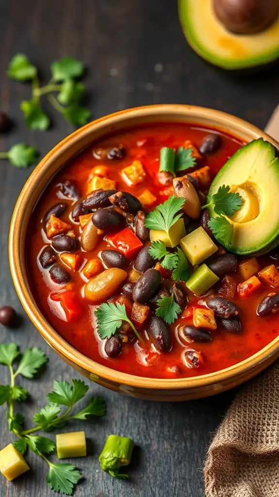 This vegetarian chili is a hearty dish that packs a punch. The vibrant colors of the ingredients make it as appealing to the eyes as it is to the taste buds. Black beans are the star here, providing protein and a rich texture. The mix of peppers and spices adds depth, making each spoonful a delight.